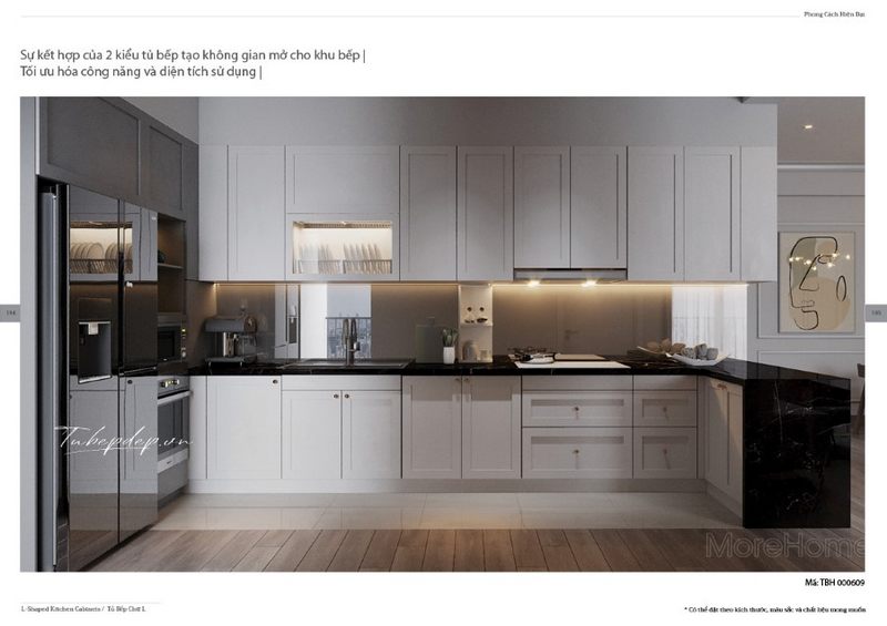 Ý tưởng thiết kế mẫu tủ bếp chung cư bằng gỗ Acrylic màu trắng chủ đạo kết hợp với đá ốp bếp nhân tạo solid surface LG sẽ tạo nên một không gian bếp hiện đại và sang trọng.