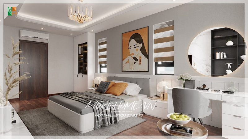 Để tạo nên không gian sống hiện đại cho phòng ngủ nữ, bố trí một chiếc gương soi tròn gần cửa sổ để phản chiếu ánh sáng vào căn phòng.