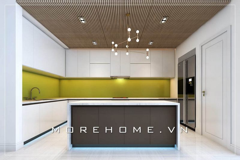 . Mẫu bàn đảo bếp gỗ công nghiệp hiện đại với thiết kế ốp đá mặt bàn màu trắng cao cấp sẽ giúp người nội trợ làm việc nấu nướng thuận tiện hơn.