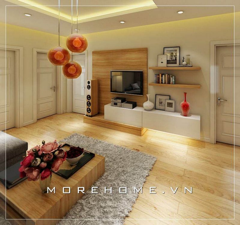 Kệ tủ tivi kết hợp với kệ trang trí gỗ công nghiệp hiện đại, đơn giản và ấn tượng sẽ làm nên sự khác biệt cho không gian phòng khách chung cư.